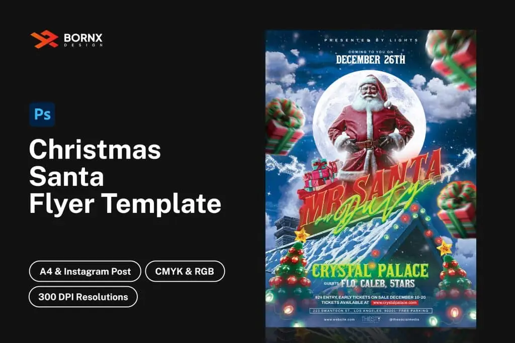 Fully customizable & very easy to edit Christmas flyer template Photoshop PSD. This flyer can be used for Christmas party event promotions. You can edit the text, add your sponsor logos, & insert your model photos via the Smart Object layer (all graphic effects will be applied automatically).