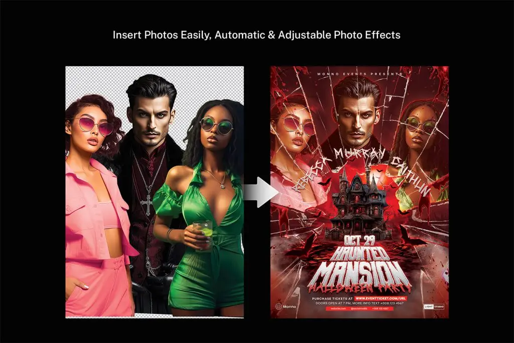 This Halloween Party Flyer Template PSD is designed to captivate attention with its eerie and bold visuals. Featuring a haunted house backdrop and striking character portraits, it’s perfect for promoting any spooky Halloween event. The template is fully customizable and comes in various sizes (A4, US Letter, Square) with CMYK and RGB color modes, ready for print or digital use at 300 DPI.