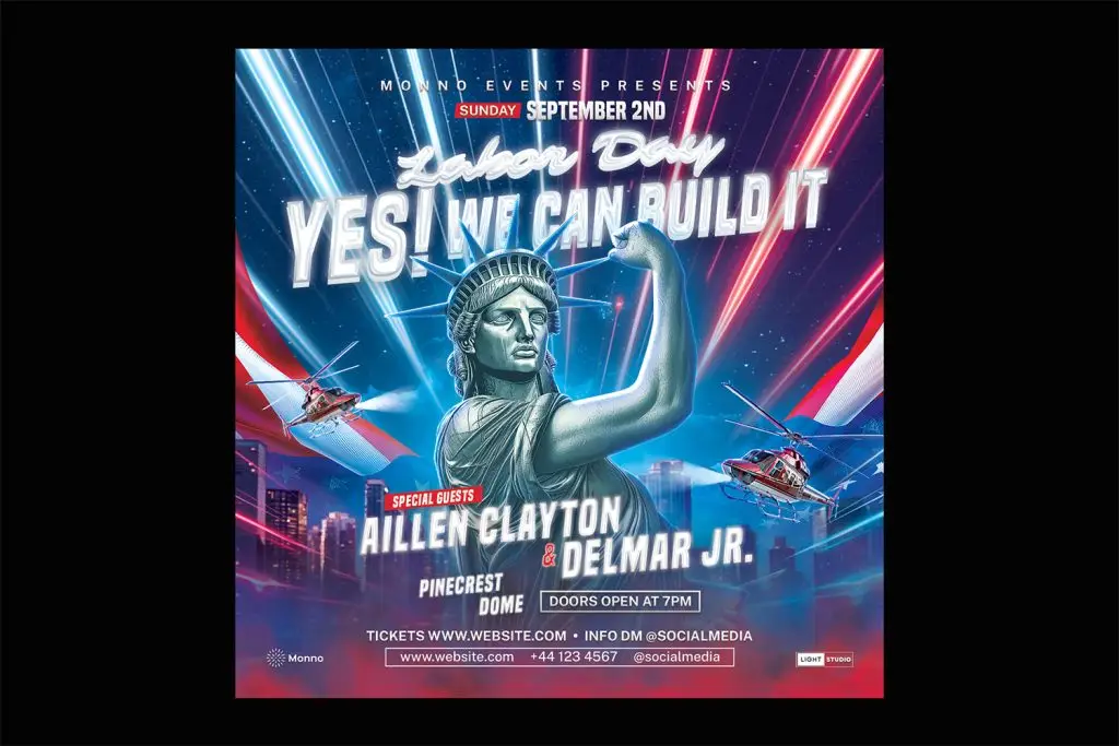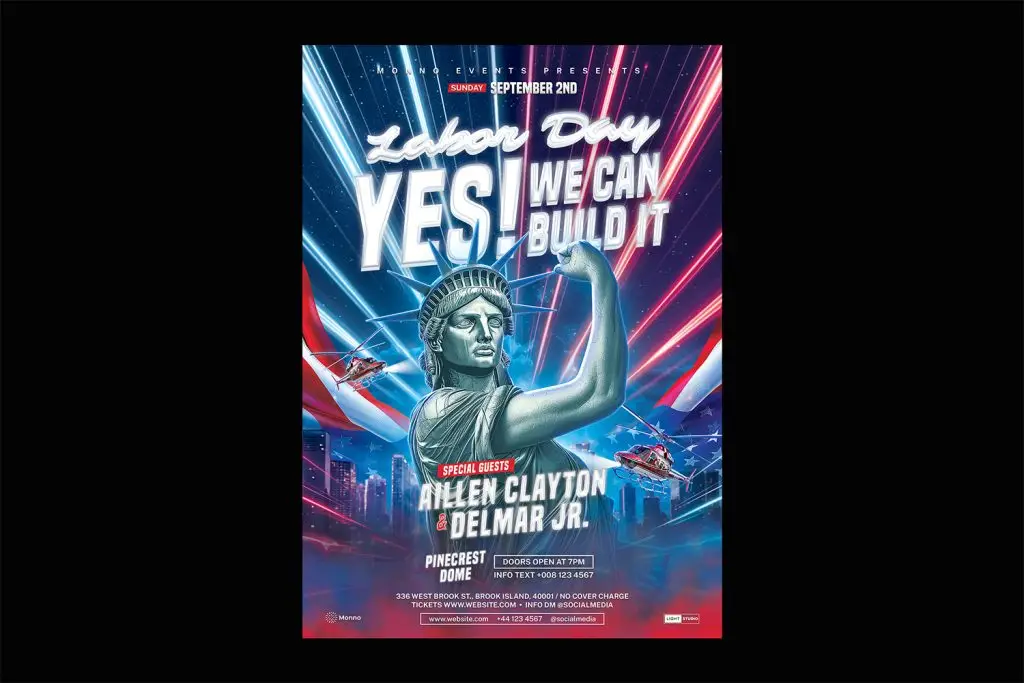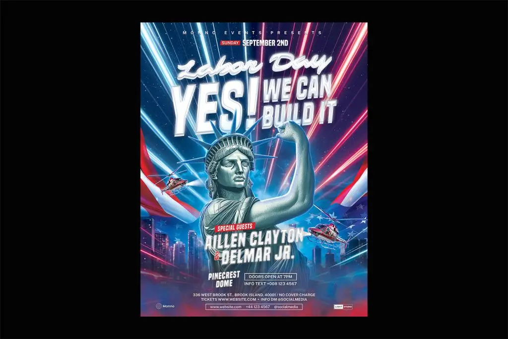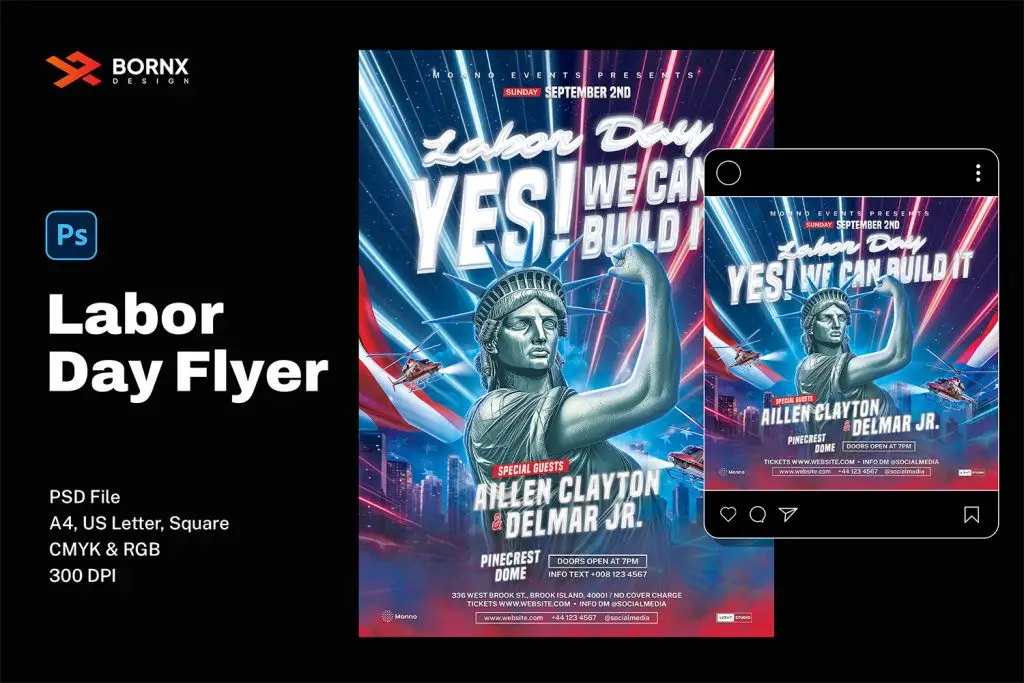 Celebrate Labor Day in style with this dynamic PSD flyer template. Perfect for patriotic-themed events, this template comes in various formats including A4, US Letter, and Square, with both CMYK and RGB color modes. Fully customizable and print-ready at 300 DPI, it’s ideal for creating eye-catching promotional materials for your Labor Day celebration.