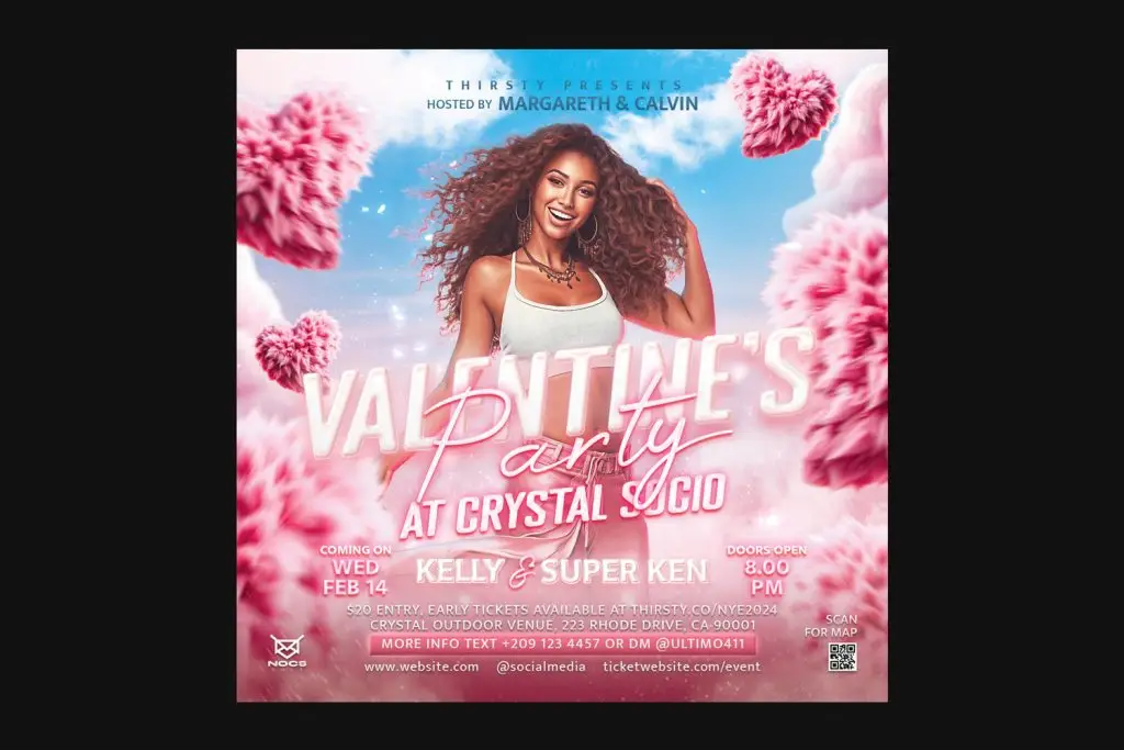 Valentine’s Day Party Flyer PSD Template, ideal for promoting your Valentine’s party or event. Edit and customize this design template using Adobe Photoshop to meet your specific needs. All text are editable. You can easily insert your model’s photo. All graphic effects will be automatically applied to your model’s photo, and you can still edit these effects to suit your preference.
